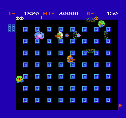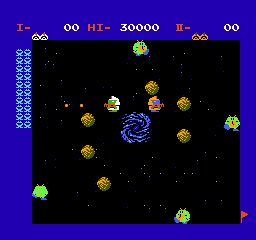 《太空青蛙》(WARPMAN)是南梦宫于1985年7月12日发行的FC平台动作射击游戏,移植自1981年街机版《WARP & WARP》。玩家通过虫洞在太空场景(射击模式)与走廊场景(炸弹人模式)间切换,需消灭指定数量敌人以通关,玩法融合了《坦克大战》的敌人数显示机制与《炸弹人》的定时炸弹策略。